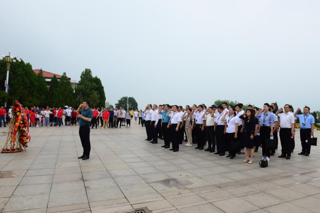 在西柏坡紀念館廣場“五大書記”銅像前,大家集體向革命先輩敬獻花籃并重溫入黨誓詞。