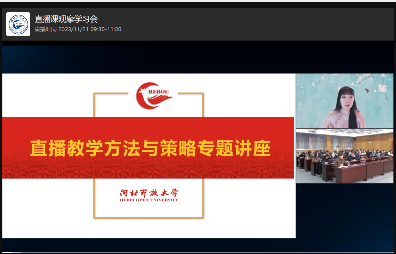 為進一步提升我校教師業務素養及直播教學水平,增強遠程教育教學能力,2023年11月21日我校在終身教育大講堂舉辦了直播教學方法與策略的專題講座。講座由教學支持部副主任單玉梅主持,西安開放大學文學博士、副教授呂潔老師受邀遠程分享直播課教學經驗。校內專兼職教師現場參會,體系教師共250余人遠程參會。
