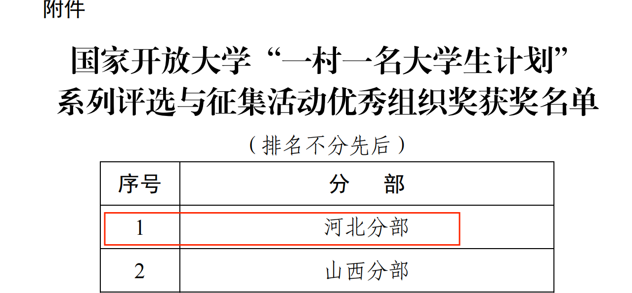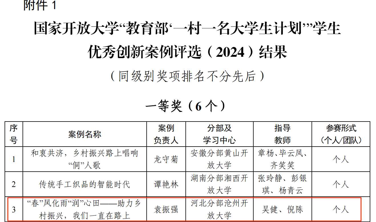 國家開放大學“教育部‘一村一名大學生計劃’”學生優秀創新案例評選結果于日前公布,我校推薦的《“春”風化雨“潤”心田——助力鄉村振興,我們一直在路上》(滄州開放大學 袁振強)在參評的93個創新案例中脫穎而出,喜獲一等獎。指導教師吳健、倪陳被評為優秀指導教師。至此,國家開放大學組織的“教育部‘一村一名大學生計劃’”招生先進單位、優秀教學單位和優秀科研成果評選,主題征文及創意視頻征集和學生優秀創新案例評選活動全部圓滿結束。因參賽積極、組織精心、成績突出,我校榮獲國家開放大學“一村一名大學生計劃”系列評選與征集活動優秀組織獎。