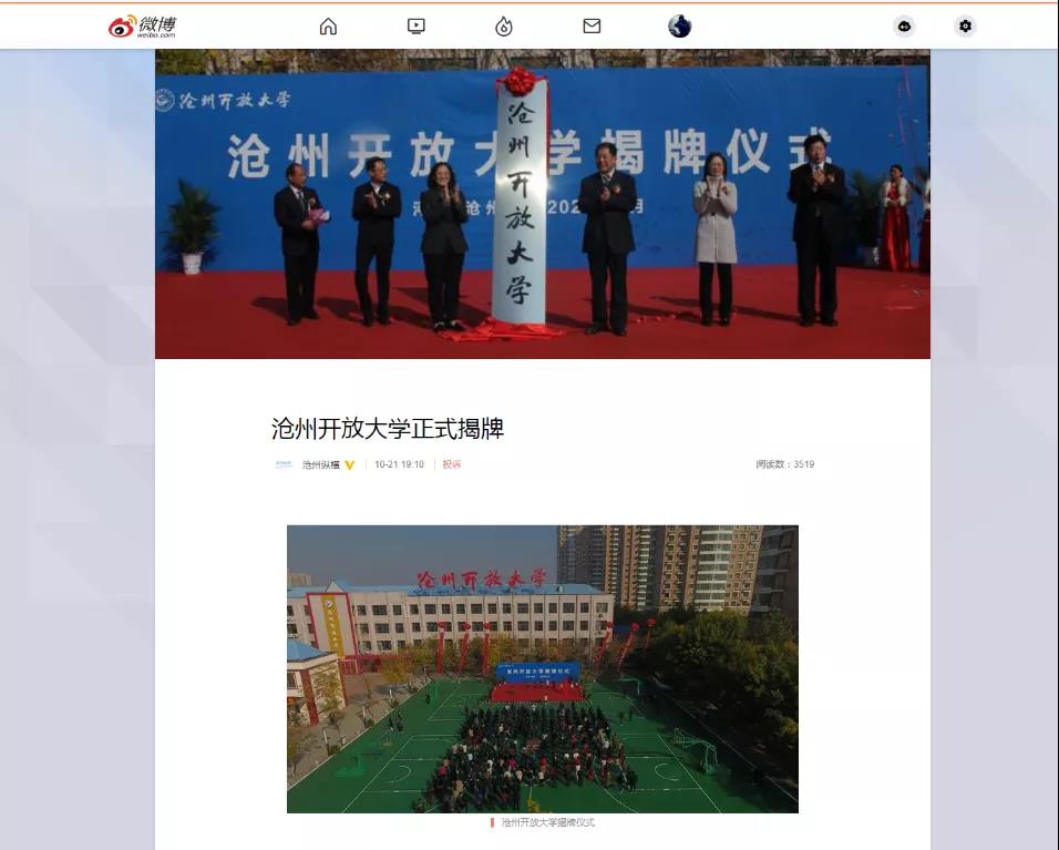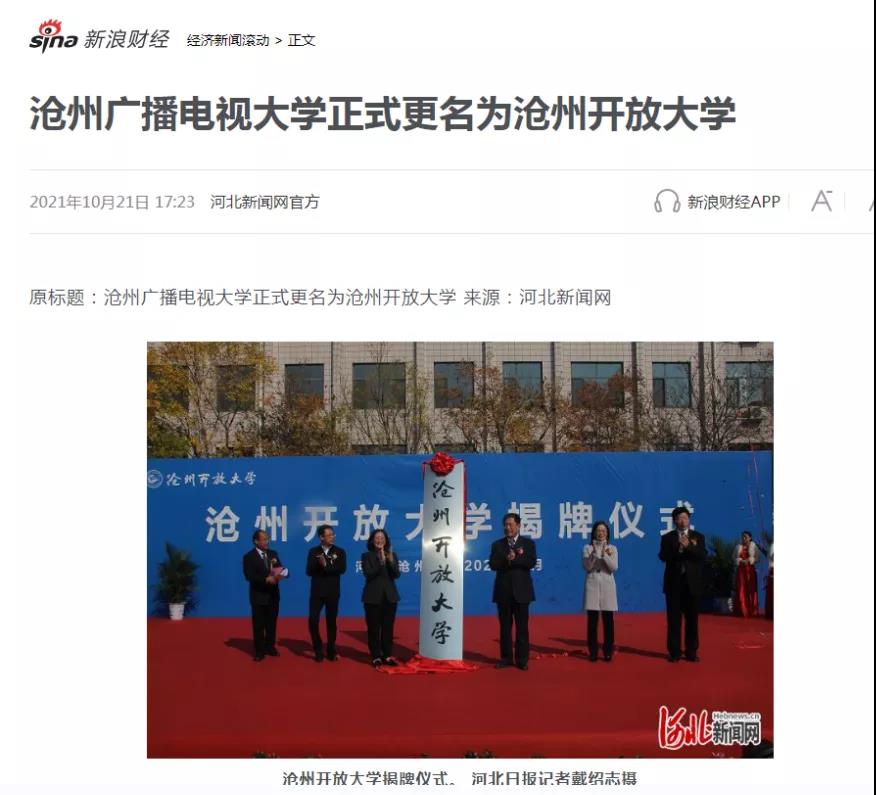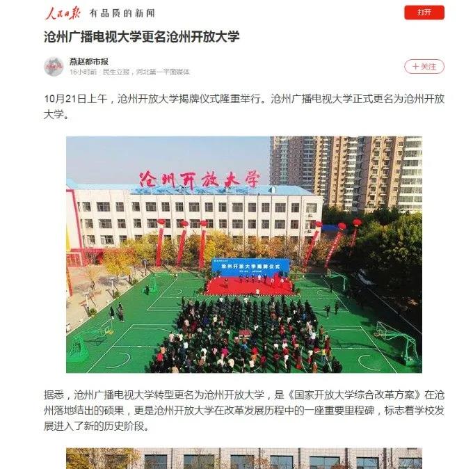日前,滄州開放大學(xué)舉行揭牌儀式,網(wǎng)易新聞、河北新聞網(wǎng)、《燕趙都市報》新媒體、長城網(wǎng)、《滄州日報》、《滄州晚報》、滄州電視臺、滄州電臺等媒體對揭牌更名和滄州廣播電視大學(xué)所做的歷史貢獻(xiàn)給予了報道。此后,《人民日報》、《瀟湘晨報》等報刊新媒體和騰訊網(wǎng)、新浪網(wǎng)、今日頭條、一點(diǎn)資訊、新浪微博等十余家媒體平臺對報道進(jìn)行轉(zhuǎn)載,進(jìn)一步提升了滄州開放大學(xué)的知名度和美譽(yù)度。
