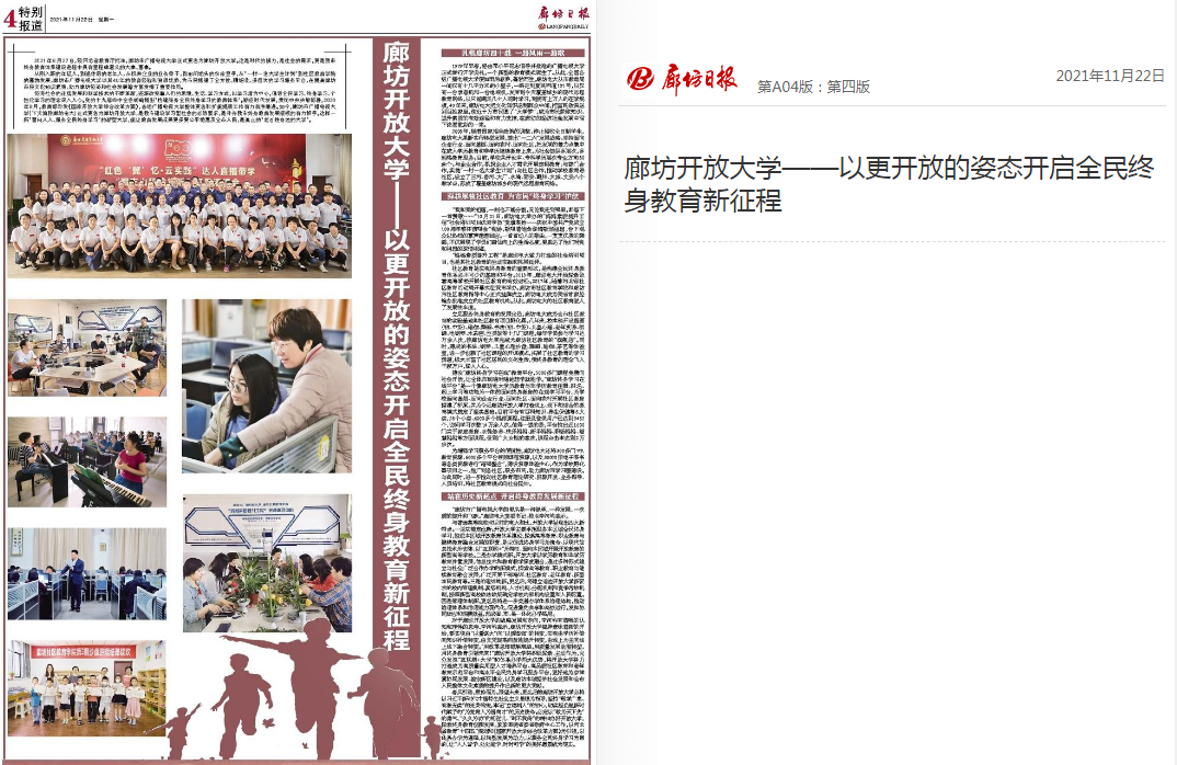 經濟社會的迅猛發展和科學技術的不斷革新,逐漸改變著人們的思維、生活、學習方式,以學習者為中心,倡導全民學習、終身學習、個性化學習的理念深入人心。黨的十九屆四中全會明確提出“構建服務全民終身學習的教育體系”。順應時代發展,貫徹中央決策部署,2020年8月,教育部印發《國家開放大學綜合改革方案》,各地廣播電視大學整體更名和擴能提質工作有力有序推進。如今,廊坊市廣播電視大學(下文簡稱廊坊電大)正式更名為廊坊開放大學,是我市建設學習型社會的必然要求,是補齊我市終身教育發展短板的有力抓手。這樣一所“面向人人、服務全民終身學習”的新型大學,能讓教育發展成果更多更公平地惠及全市人民,是真正的“老百姓身邊的大學”。