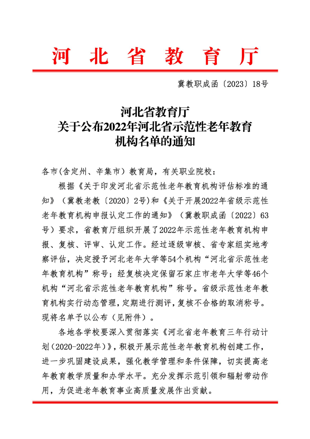 日前,河北省教育廳公布了 2022 年全省示范性老年教育機構名單,滄州開放大學被評為“河北省示范性老年教育機構”。