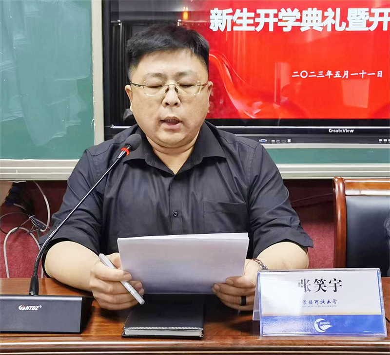 張笑宇在開學(xué)典禮上致辭,歡迎新生朋友們加入開放大學(xué)這個大家庭,表達(dá)了對23年春季新生的期許與祝福。