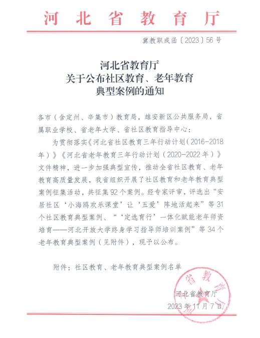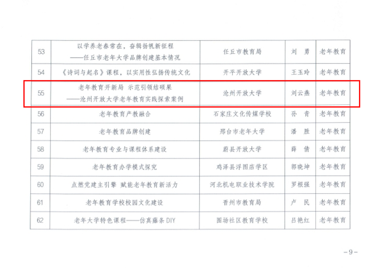 近日,滄州開放大學(xué)的《老年教育開新局示范引領(lǐng)結(jié)碩果-滄州開放大學(xué)老年教育實(shí)踐探索案例》被河北省教育廳評(píng)為“老年教育典型案例”。