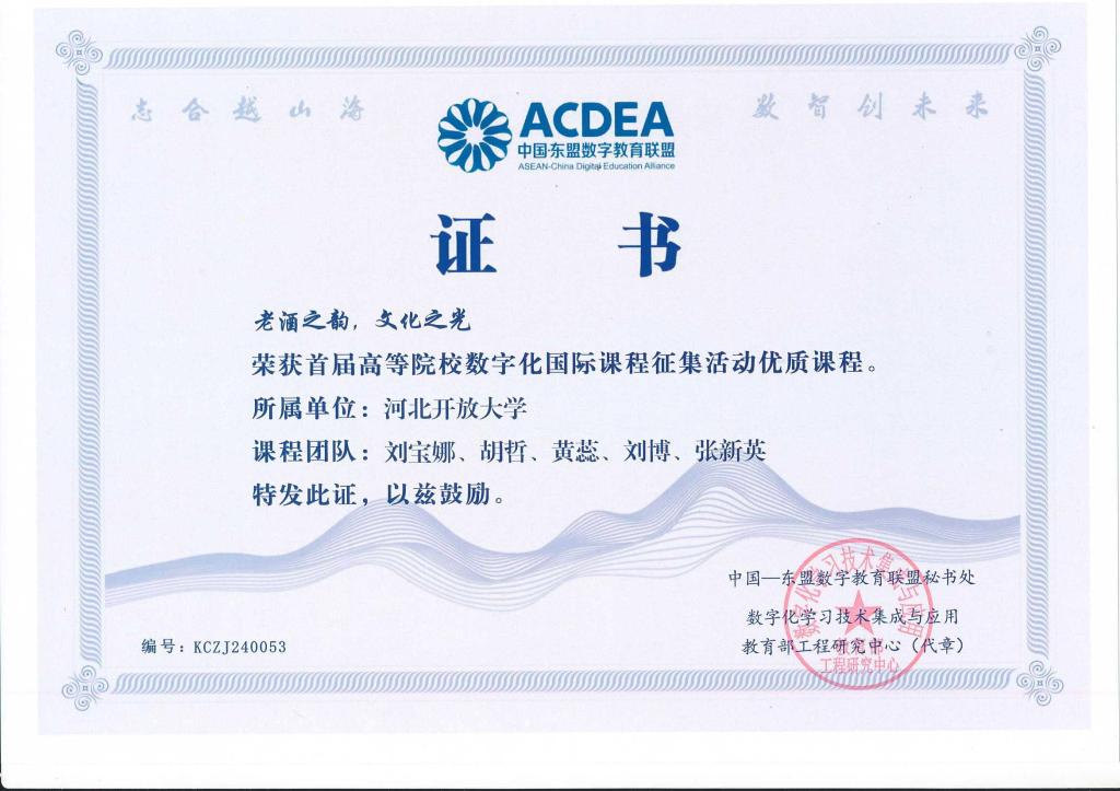 近日,數(shù)字化學習技術(shù)集成與應用教育部工程研究中心公布了“首屆高等院校數(shù)字化國際課程征集活動優(yōu)質(zhì)課程名單”,承德開放大學劉寶娜團隊的作品《老酒之韻,文化之光》從264家高校,777門課程中脫穎而出,代表河北開放大學入選該優(yōu)質(zhì)課程名單。