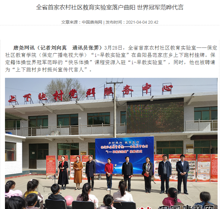 在鞏固拓展脫貧攻堅(jiān)成果,接續(xù)推動(dòng)脫貧地區(qū)發(fā)展和鄉(xiāng)村全面振興的關(guān)鍵時(shí)期,保定社區(qū)教育學(xué)院率先發(fā)力、精準(zhǔn)施策,以“鄉(xiāng)村振興,教育先行”為切入點(diǎn),在曲陽(yáng)縣上下跑村掛牌全省首家農(nóng)村社區(qū)教育實(shí)驗(yàn)室——“i-早教實(shí)驗(yàn)室”,邀請(qǐng)?bào)w操世界冠軍范曄“快樂(lè)體操”入駐并為上下跑村鄉(xiāng)村振興代言。這是發(fā)揮學(xué)校優(yōu)勢(shì)開(kāi)展精準(zhǔn)扶貧、教育扶貧的有益嘗試,也是鞏固拓展脫貧攻堅(jiān)成效、有效銜接鄉(xiāng)村振興的有益探索,更是發(fā)展公平而有質(zhì)量的教育、開(kāi)展農(nóng)村社區(qū)教育的有益實(shí)踐。中國(guó)教育在線、唐堯網(wǎng)、保定晚報(bào)、保定電視臺(tái)等媒體對(duì)此進(jìn)行報(bào)道。